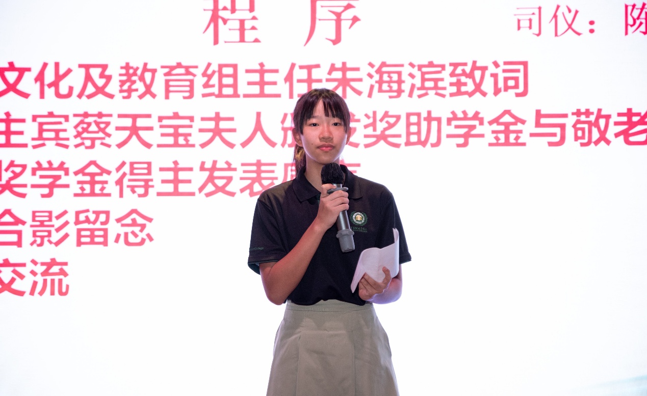 颁发仪式上,主宾蔡天宝夫人在会长张振铭、文教组主任朱海滨,以及互助部主任王为森、会员组主任陈毅坚等会馆领导陪同下,分别颁发奖学金、助学金及敬老贺岁金。奖学金得主张思婷代表学生发表感言,感谢会馆长期以来对教育的重视与支持。